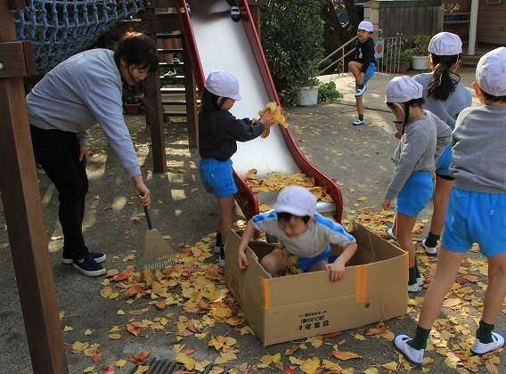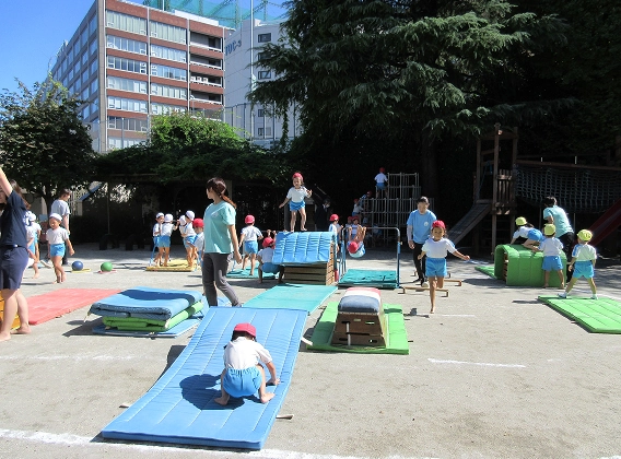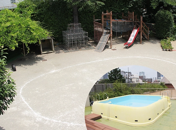 園庭には、いちょう・コナラ・もみじ・もくれん・菩提樹・さるすべり等たくさんの木々があり、屋上にも植栽帯があります。そしてこどもたちの遊びの傍らには草花が咲き、カメやメダカがいて、小さなビオトープに時折トンボが卵を産み付けます。春にはテントウムシを発見したり、おたまじゃくしやミカンの木に生まれたアオムシを育てたり、四季を全身で感じながら、命の尊さを学んでいきます。都会にありながら、土に触れ、風に吹かれ、自然と共に育つ経験が出来る様考えられています。
