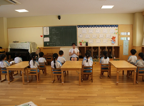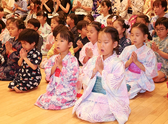 日々の保育において、静の時間も大切にしているのが専修幼稚園の特色です。毎朝の座禅や食事前の静かな時間は、心に落ち着きをもたらす大切なひとときです。幼いこどもにとって、「目を閉じる」という行為は難しいことですが、この習慣を繰り返すことで、落ち着きや集中力、自律心を育みます。「外に向かう元気さ」と「内に向かう静けさ」。その両方のバランスを大切にした保育が、人生を切り拓く力の土台となります。