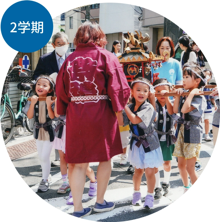 二学期の最初のお楽しみは園まつり。お父様やお母様方が、この日のためにずっと前からいろいろなゲームの準備をしてくださいます。お庭の菩提樹やコナラの葉が、こどもみこしの元気なかけ声にゆれています。