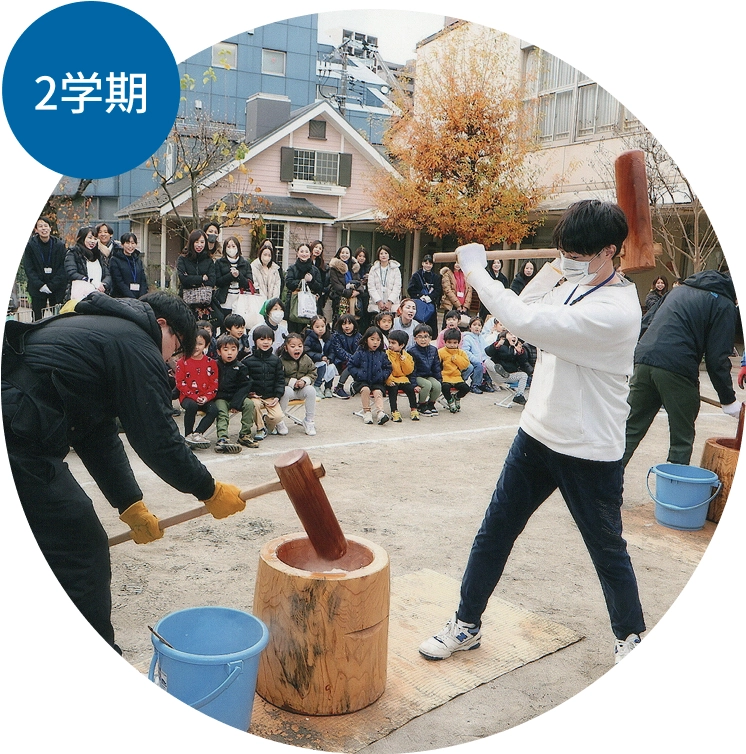 二学期の最後は、おもちつき。前日からもち米をとぎ、お父様や卒業生のお母様方たくさんの応援をいただいて、つきたてのおもちをいただきます。