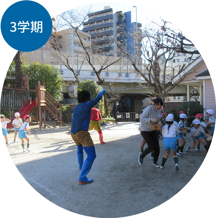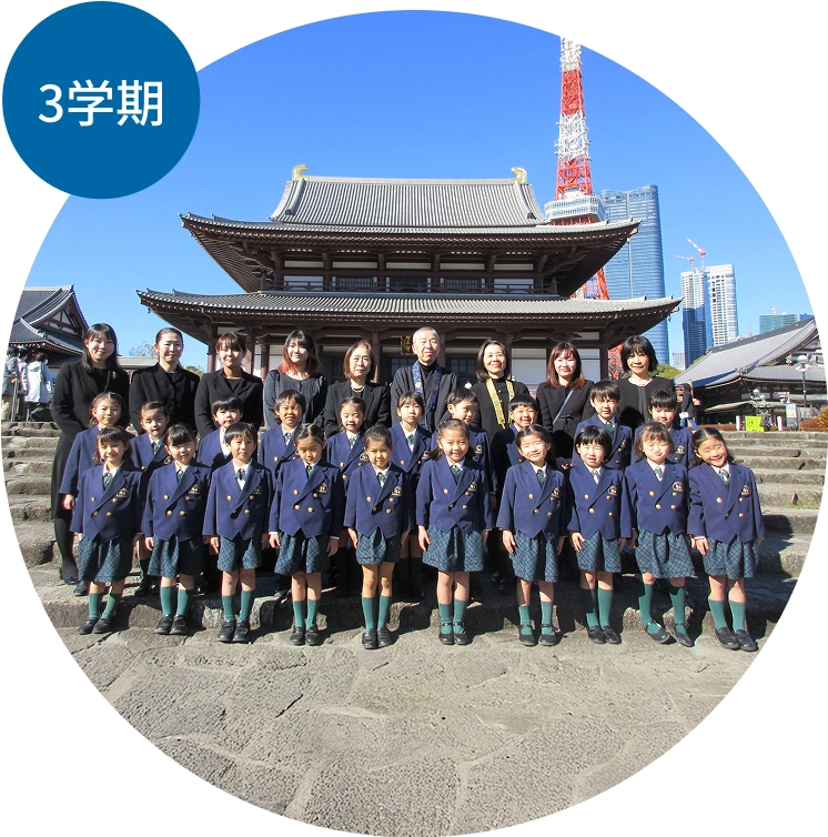 春は名のみの風の寒い日が続くこの時期でも、専修幼稚園のこども達はなるべく薄着をします。さむがり鬼も、泣き虫鬼もいばり鬼も、鬼はーそとー!音楽発表会は、みんなの心がひとつになる「和」を体験します。年長クラスは、浄土宗の大本山である増上寺へ参拝し、般若心経をお唱えします。