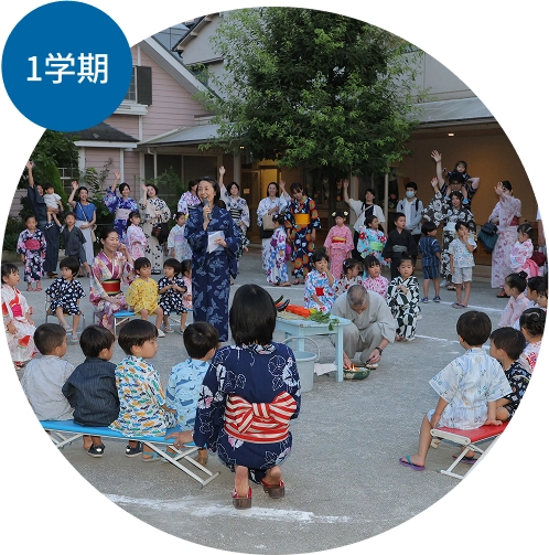 梅雨の晴れ間、水着に着替えて、元気いっぱいに、はだしでお庭にとびだしていくこども達。年少クラスのお着替えもずいぶん上手になりました。みたままつりには、ご先祖さまのみたまをお迎えして、おうちの方と一緒に楽しい盆踊り。年長クラスは、幼稚園におとまり会のお楽しみがあります。