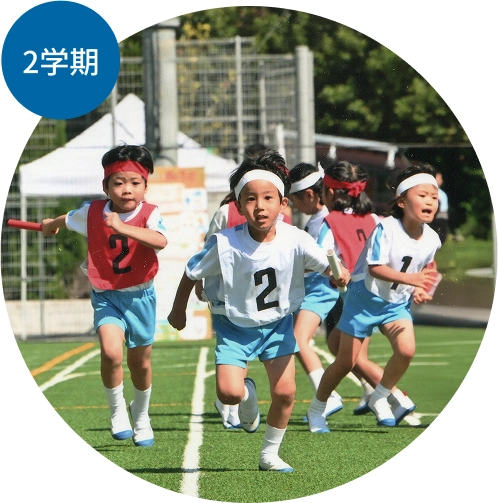 みんな大好きな運動会。ひとりひとりが元気に力を出してがんばります。年少・年中クラスはかけっこ、玉入れ、綱引き…。年長クラスはリレーや組立体操に挑戦します。