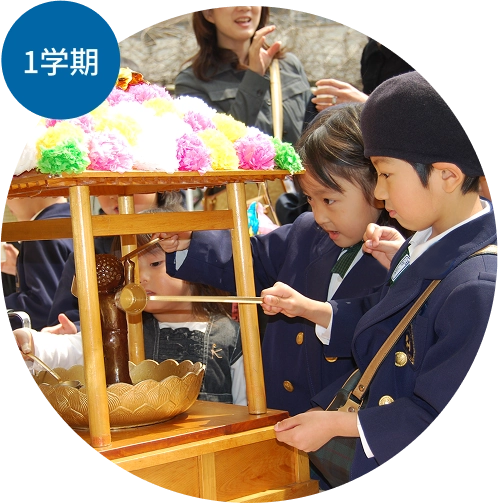8日の花まつりの日、桜のご門をくぐって登園します。入園・進級に、心弾む気持ちと、ちょっぴりどきどきの気持ちが混ざりながら、おしゃかさまに甘茶をかけて、新しい生活のスタートです。